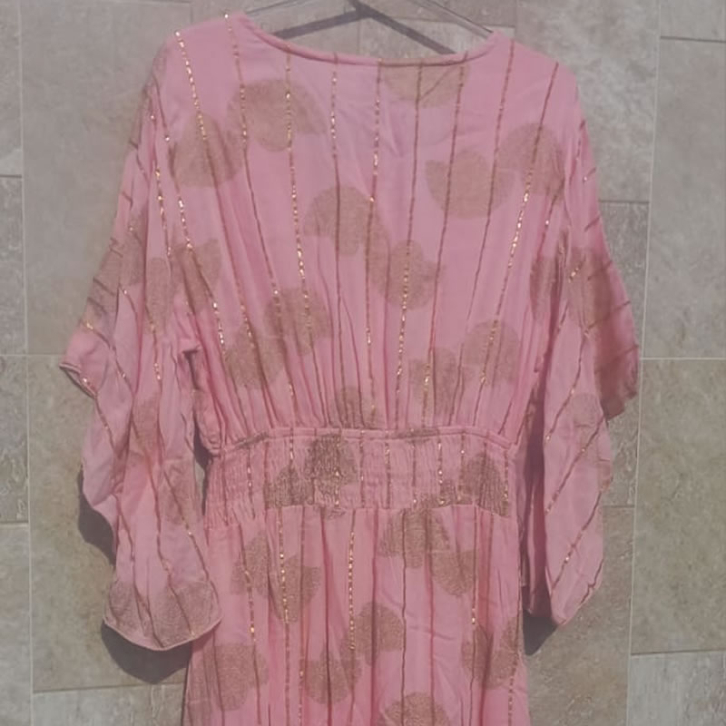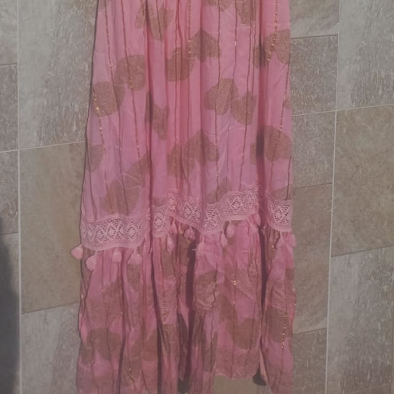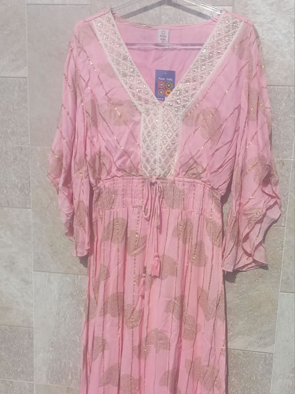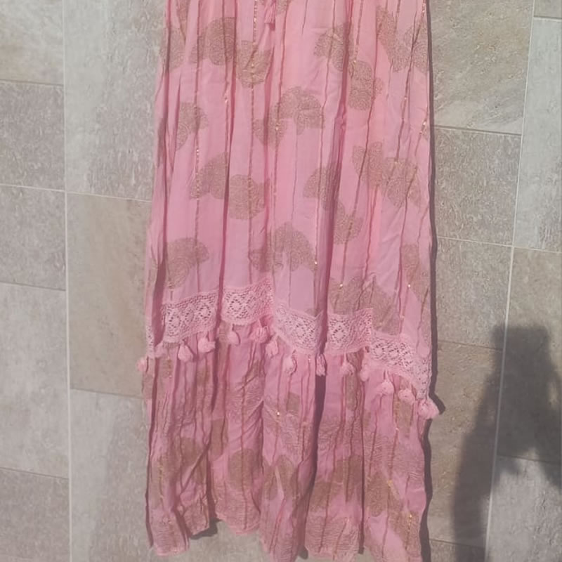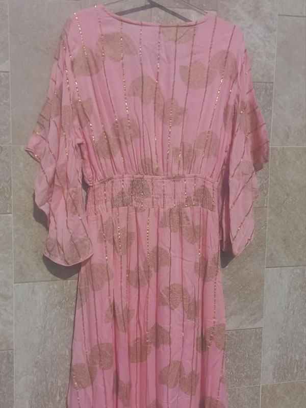 V0005 Vestido Longo na Cor Rosa, Lurex, Detalhes com Brilho, Tamanho M, Veste 38 até 42, Peso: 436 gramas